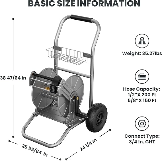 - Large Hose Capacity: Holds 150 ft of 5/8 inch garden hose or 200 ft of 1/2 inch garden hose. But NOT with the 3/4-inch hose (hose not included). Fitted with 5 ft lead-in hose, the large capacity of garden hose reel cart make it a great helper for your garden and yard.